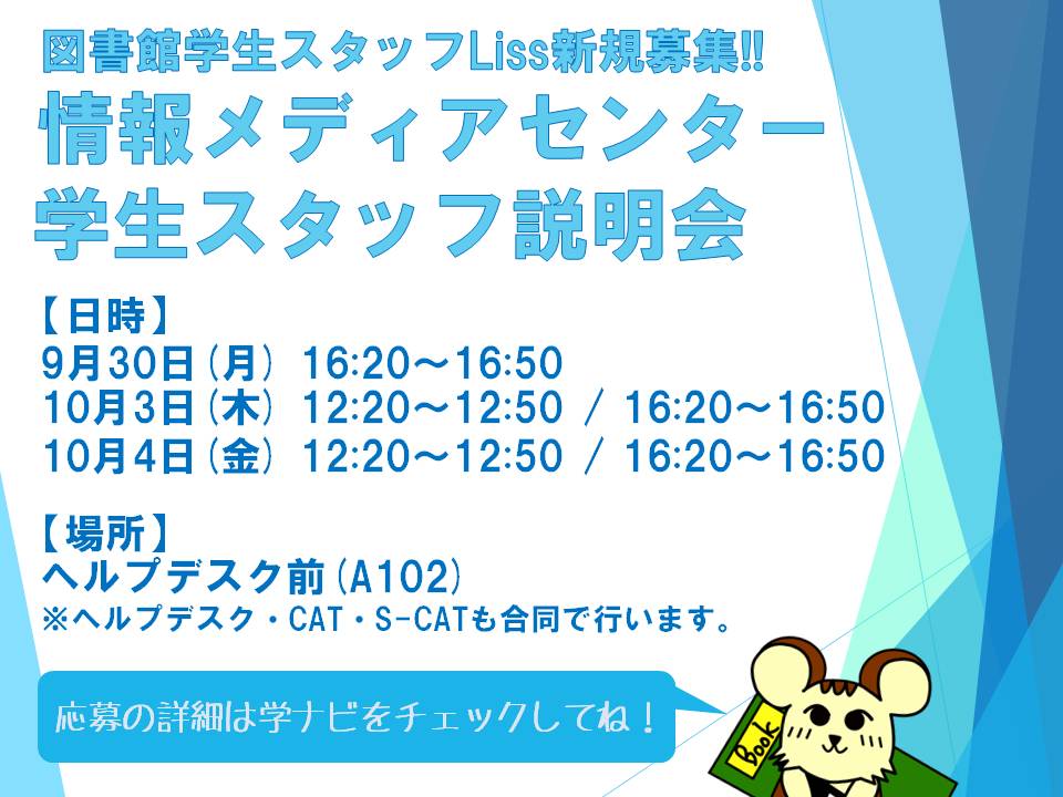 Lissだけではなく、ヘルプデスク・CAT・S-CATの説明も同時に行います!少しでも興味があるという学生は、ぜひ来て下さい!(応募には、説明会の参加が必須になります)