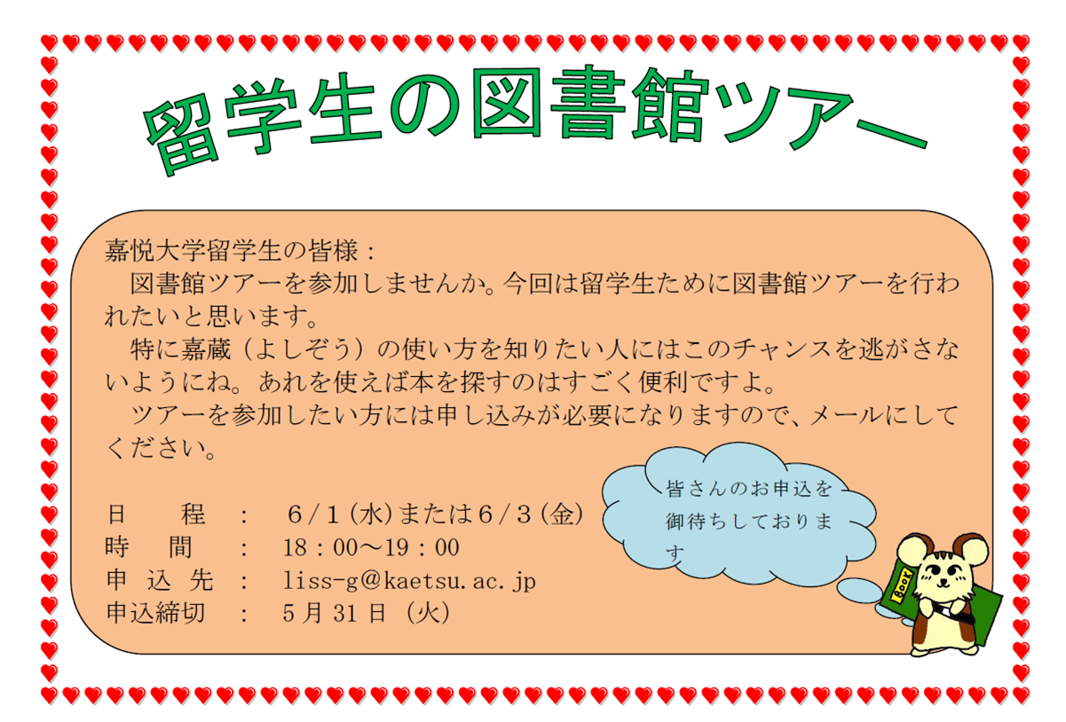 参加したい方は、図書館のカウンターに問い合わせください